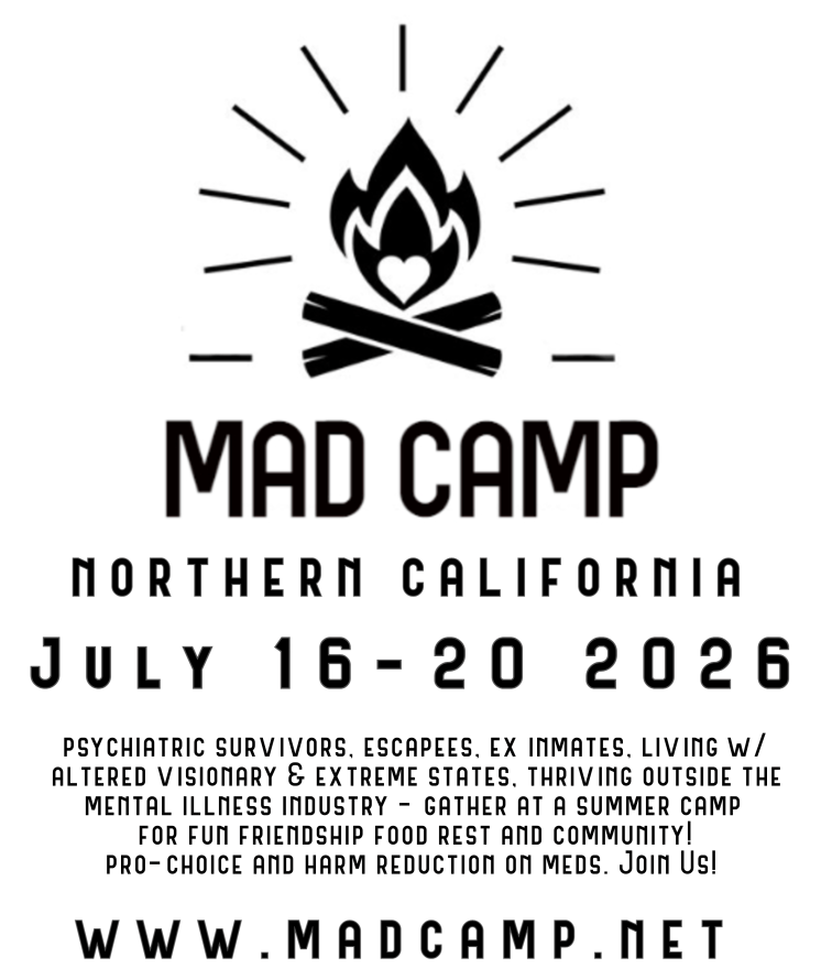 We are the Mad Camp crew, survivors of psych diagnosis and extreme states who live outside psychiatry and have been activists and advocates for abolishing the mental health system and replacing it with love.